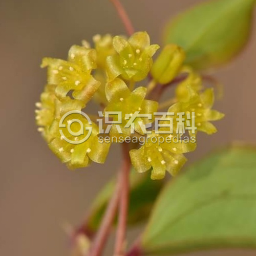 根莖橫走,粗大,堅(jiān)硬,木質(zhì),彭大部分呈不規(guī)則的菱角狀,疏生須根,棕色。莖有疏刺。葉互生,片革質(zhì),有光澤,干后紅褐色或古銅色,寬卵形或橢圓形,先端短尖或圓形,基部近圓形或心形,全緣,光滑,下面微白。傘形花序腋生于小枝上;花單性,雌雄異株,綠黃色,花6數(shù)。漿果球形,紅色,種子1-3粒。花期4-5月。果期6-8月。
